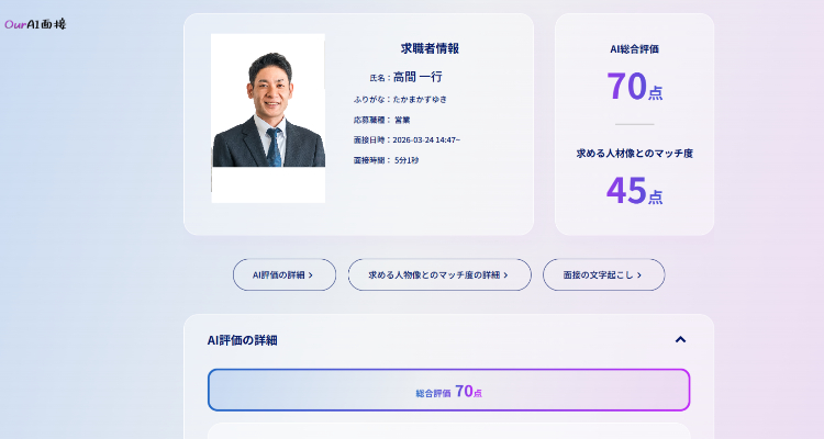 ➡採用プロセスを全てAI面接官が担当するのではなく、AI面接官はあくまでも採用担当者のサポートとして考えて頂くと良いです。Our AI面接でポジションによる人材採用の基準を標準化することができます。これにより、採用担当者が実際に面接する二次面接段階で、ポジションが求める人材と求職者の適性の大きなミスマッチを防ぎ、人材採用が堅実に進みます。