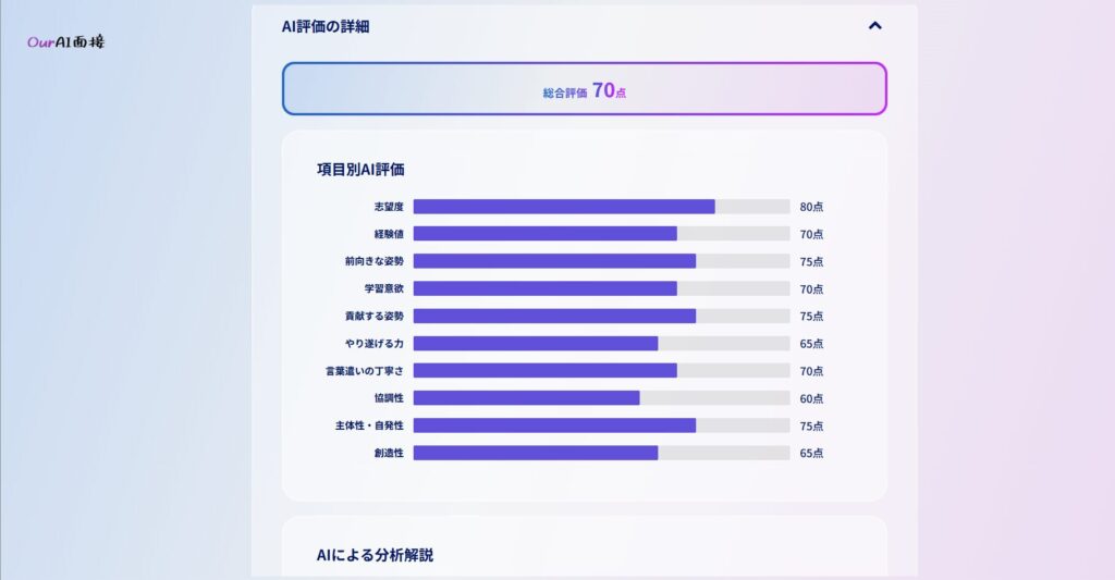 分析リポートには、総合評価だけでなく評価軸に対する点数やその根拠などが明確に記載され、ベテランの採用担当者と同等以上の第三者的な説得力を持っています。