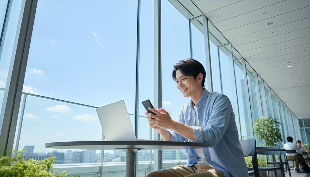 安定したWiFi環境、モバイル通信、インターネット環境があれば、スマホ、タブレット、PCなどから求職者がいつでも・どこでもアバター面接官と面接できます。しかも、面接用のアプリをダウンロードする必要がないため、お手軽に面接できます。